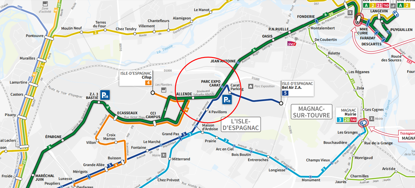 - Soit Ligne 5 : Arrêts 4 Pavillons ou Parc Expo